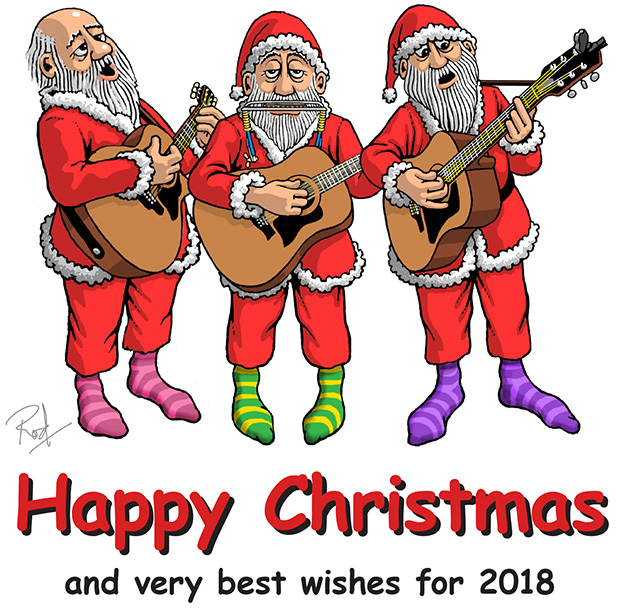 Dear All, I have just seen that you have heard absolutely nothing from me since the end of March. I feel very bad about that and I suppose the only excuse I have is advancing years ! Things seem to take me two or three times longer than they ever used to. That's partly to do I suppose with the fact that I no longer have clients leaning over my shoulder imposing deadlines ! Whatever the reason I do feel as if I spend my time running to keep up these days and wonder how I ever managed to find time to do any proper work. I do actually have a commercial(-sh) project now in progress which involves building a very large 3D digital model and eventually some fly round and-or through animations. But generally the rather tiny pensions do not quite make the annual budget balance so my new career over the past two or three years has been as a garden labourer for the team of Horticultural Ladies my wife Val is a member of. Quite challenging physically which is good but sometimes leaves me less than enthusiastic at the end of the day about restarting to try and extract stuff from the remaining boxes of H2G2 artwork. Having said which I had thought it would only be a short gap but it's turned out to be quite a long time ! My apologies and I am going to do better from mid January. There were two things I always wanted to do if I ever found I had a bit of time to myself again. One was to try and indulge my enjoyment of actual drawing with "real" media again, and the other was to rediscover my enjoyment of playing the guitar in the hope of trying to get a bit better at it. Since giving in to the threat of expulsion from St Martins in 1966-67 if I didn't give up the band and knuckle down to some "proper work" this has been something that has been pushed into the background ever since. Last year's Christmas card was prompted by my new "career" … this year's is prompted by my pleasure in being able to finally achieve one of those items on my list thanks to my Thursday afternoon jamming partners Brian and Steve (who look absolutely nothing like any of the Santas !). We played our first (unpaid) gig last month ! So all I need to do now is summon up from somewhere the courage and confidence required to pick up pen and brush and make that first mark on a virgin piece of paper. Will get there eventually ! In the meantime I wish you all a very HAPPY CHRISTMAS and a Great New Year and may 2018 be good to you all Best wishes to all, Rod To be taken off the mailing list please reply with "REMOVE" in the subject or content.